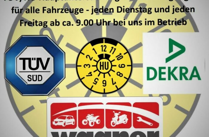 TÜV/HU Hauptuntersuchung* und Eintragungen* für alle Fahrezuge - jeden Dienstag um ca. 15.30 Uhr und jeden Freitag um ca. 9 Uhr bei uns im Betrieb